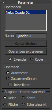 Mit den Optionen in diesem Bereich können Sie angeben, welche Auswahlebene durch den Stapel weiter nach oben gegeben wird. Das KonturZusammenführen-Objekt speichert alle Auswahlebenen: die Scheitelpunkte, Flächen und Kanten der mit dem Objekt zusammengeführten Kontur. (Wenn Sie den Modifikator "Netz auswählen" anwenden und zu den einzelnen Unterobjektebenen gehen, stellen Sie fest, dass die zusammengeführte Kontur ausgewählt ist.) Wenn Sie also nach dem Modifikator "KonturZusammenführen" einen Modifikator anwenden, der auf eine bestimmte Ebene wirkt, wie z. B. "Fläche extrudieren", funktioniert dieser Modifikator wie gewünscht.