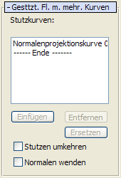 Die Liste "Stutzkurven" zeigt die Namen der ausgewählten Kurven an. "Stutzen umkehren" kehrt die Stutzrichtung um. Mit "Normalen umkehren" können Sie die Oberflächennormalen beim Erstellen umkehren. (Nach dem Erstellen können Sie die Normalen mit den Steuerelementen des Rollouts "Oberfläche allgemein" umkehren.)