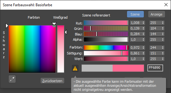 Wenn Sie die OCIO-basierte Farbverwaltung verwenden und Farben im Szenenbereich einstellen, geben die Schieberegler die Farben an, die mithilfe von schwarzen Streifen auf der Anzeige nicht reproduziert werden können. Sie können diese Farben weiterhin auswählen, und die Anzeige zeigt die Bildschirmfarbe an, die der Auswahl am ehesten entspricht. Darüber hinaus wird ein Warnsymbol angezeigt. Bewegen Sie den Mauszeiger über das Symbol, um zu sehen, ob sich die Farbe außerhalb des Anzeige- oder Render-Bereichs oder beides befindet.