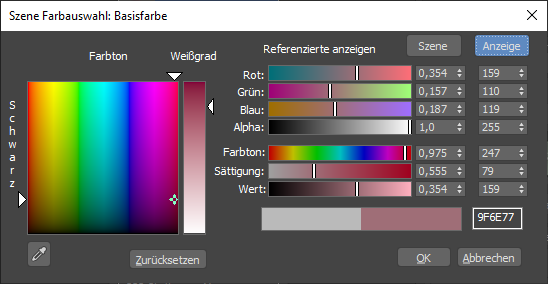Verwenden Sie das Dialogfeld Farbauswahl, um viele Farbparameter festzulegen, zum Beispiel Lichtfarben, Materialfarben, Hintergrundfarben und benutzerdefinierte Objektfarben. Sie können Werte entweder im Render- oder im Anzeigebereich festlegen, indem Sie drei verschiedene Farbmodelle verwenden, um die gewünschte Farbe genauer einzugrenzen.