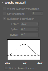 Mit den Steuerelementen in diesem Dialogfeld können verschiedene Parameter für "Weiche Auswahl" geändert werden. Für alle Unterobjektebenen gelten dieselben Parameterwerte für "Weiche Auswahl". Die Option "Weiche Auswahl" ist für NURBS-, Netz-, Poly- , Patch- und Spline-Objekte verfügbar.