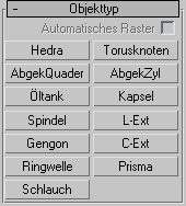 Zusätzlich zu den Standard-Grundkörpern enthält 3ds Max auch eine Gruppe erweiterter Grundkörper. Sie können die Grundkörper leicht mit der Maus im Ansichtsfenster erstellen (siehe Objekt erstellen). Die meisten Grundkörper können auch über die Tastatur erstellt werden. Diese Grundkörper werden im Rollout Objekttyp und im Menü Erstellen