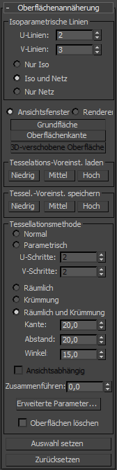 Die Steuerelemente im Rollout "Oberflächenannäherung" sind identisch mit den Steuerelementen für die Flächenannäherung für NURBS-Oberflächenobjekte, verfügen jedoch über zwei zusätzliche Schaltflächen: "Auswahl setzen" und "Zurücksetzen".