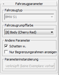 - Die Karosseriefarben werden gleichmäßig auf jedes Fahrzeug verteilt, das in der Szene platziert ist. Mit diesem Steuerelement können Sie eine bestimmte Farbe für das Fahrzeug auswählen.