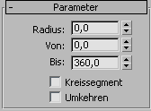 Erstellt einen Bogen-Spline über die Tastatur. Verwenden Sie die X/Y/Z-Einstellungen, um den Mittelpunkt anzugeben, und die verbleibenden Parameter, um den Radius und die Bogengrenzen festzulegen. Klicken Sie dann auf "Erstellen". Nach dem Erstellen der Spline können Sie über die Steuerelemente des Rollouts "Parameter" die Einstellungen anpassen (siehe unten).