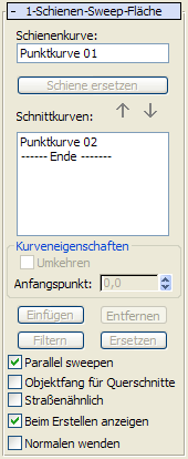 Während ein 1-Schienen-Sweep-Unterobjekt ausgewählt ist, wird ein Rollout mit den Parametern des 1-Schienen-Sweep eingeblendet. Dieses Rollout wird nur angezeigt, wenn genau ein 1-Schienen-Sweep-Unterobjekt markiert ist. Sie können jeweils nur einen 1-Schienen-Sweep bearbeiten; deshalb wird dieses Rollout im Gegensatz zu anderen NURBS-Unterobjekten nicht angezeigt, wenn mehrere 1-Schienen-Sweep-Unterobjekte ausgewählt sind.