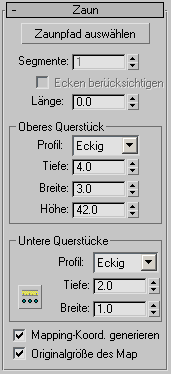 Als Vorgabe wird von 3ds Max das obere Querstück zusammen mit zwei Pfosten, einem unteren Querstück auf halber Geländerhöhe und zwei Latten mit gleichmäßigem Abstand erstellt.