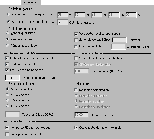 Im Fensterbereich „Optimierung“ können Sie die zu erzeugenden Optimierungsstufen sowie die aktiven Optionen auswählen.