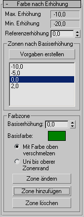 - Erstellt Erhöhungszonen. 3ds Max listet im unteren Teil jeder Zone die Erhöhung auf, die mit der Bezugsgröße (der Referenzerhöhung) referenziert ist. 3ds Max wendet an der Basiserhöhung die Farbe der Zone an. Ob die Farben zwischen den Zonen ineinander übergehen, hängt davon ab, ob Sie "Mit Farbe oben verschmelzen" oder "Uni bis oberer Zonenrand" aktivieren.