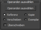 - Wenn Sie auf "Operanden auswählen" klicken, wird durch die ausgewählte Kopiermethode festgelegt, wie die Operanden verwendet werden. Wenn "Verschieben" als Methode verwendet wird, werden die Original-Konturdaten aus der Szene in die Operanden des neuen Geländeobjekts verschoben. Bei "Kopie", "Referenz" und "Instanz" verbleiben die Original-Konturdaten in der Szene, und im Geländeobjekt werden Kopien, Referenzen oder Instanzen der Konturdaten als Operanden erstellt. Dies funktioniert ähnlich wie die Kopiermethode bei booleschen Operationen.