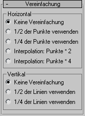 - ½ der Linien verwenden Verwendet die Hälfte der Spline-Operanden des Geländeobjekts, um ein weniger komplexes Netz zu erstellen. Damit erhalten Sie weniger Details, aber auch eine kleinere Datei als mit Keine Vereinfachung.