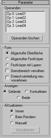 Wählen Sie nach dem Importieren von Konturdaten die Objekte aus, und klicken Sie auf die Schaltfläche Gelände. 3ds Max erstellt anhand der Konturdaten ein neues Dreiecksnetzobjekt. Als Name des Geländeobjekts wird der Name des ersten ausgewählten Splines verwendet. Andere Splines in der Auswahl werden entsprechend den Einstellungen für "Referenz", "Verschieben", "Kopie" oder "Instanz" im Rollout "Operanden auswählen" behandelt, wie im Folgenden erläutert.