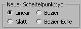 Mithilfe der Optionsfelder in diesem Bereich können Sie die Tangente der neu erstellten Scheitelpunkte bestimmen, wenn Sie Segmente oder Splines bei gedrückter Umschalttaste klonen. Wenn Sie später "Kopieren und verbinden" anwenden, erhalten alle Scheitelpunkte auf den Splines, die das ursprüngliche Segment oder Spline mit dem neuen verbinden, den in dieser Gruppe angegeben Typ.