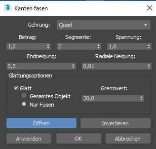 Tri: Ersetzt jede gefaste Kante durch eine Reihe von Polygonen, die dem aktuellen Segmentewert entsprechen. Dadurch wird auch der Segmentewert von gefasten Kanten zwischen nicht koplanaren Polygonen erhöht, was zur Rundung des abgefasten Bereichs führen kann. Mit dieser Methode werden sowohl dreiseitige als auch vierseitige Polygone erzeugt. Bei Verwendung von dreiseitigen Polygonen kann es beim Glätten oder Unterteilen zu Netzproblemen kommen.