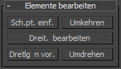 Auf der Unterobjektebene Element sind in diesem Rollout Befehle verfügbar, die für Polygone und für Elemente gleich sind. Auf der Ebene "Polygon" enthält das Rollout sowohl diese Befehle als auch weitere Befehle, die nur für Polygone verfügbar sind. Die auf beiden Ebenen verfügbaren Befehle sind "Scheitelpunkt einfügen", "Spiegeln", "Triangulation bearbeiten", "Neu triangulieren" und "Drehen".