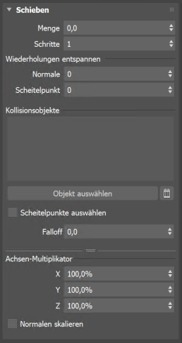 - Normalen skalieren: Wenn diese Option aktiv ist, skalieren Sie nicht die Netzdaten des Objekts, sondern begrenzen den Einfluss des Drücken-Betrags auf die Achse über einen Wert von 0 (kein Effekt) bis 100 (vollständiger Effekt).