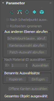 Mit den Symbolen im oberen Bereich des Rollouts "Auswahl" können Sie die Methode der Flächenauswahl bestimmen. Wenn Sie hier auf eine Schaltfläche klicken, entspricht dies der Auswahl eines Unterobjekttyps im Modifikatorstapel. Durch erneutes Klicken auf die Schaltfläche deaktivieren Sie diese und kehren wieder zur Objektauswahlebene zurück.