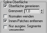 ) "Spline-Oberfläche" steht nur im Modifikator "Patch bearbeiten" zur Verfügung; im Objekt "Bearbeitbares Patch" ist er nicht verfügbar. Der Bereich wird verfügbar, wenn das Objekt, auf das der Modifikator "Patch bearbeiten" angewendet wird, aus Splines besteht. Mit den Steuerelementen des Bereichs wird die Funktion des Modifikators "Oberfläche" bereitgestellt.