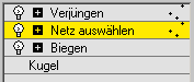 Wenn Sie eine Unterobjektauswahl vornehmen, zeigt der Stapel durch eine Veränderung an, dass Sie nicht mehr mit dem ganzen Objekt arbeiten. Betrachten Sie die Wirkung, die sich ergibt, wenn Sie den Modifikator "Netz auswählen" zwischen den Modifikatoren "Biegen" und "Verjüngen" anwenden ("Biegen" befindet sich unter "Verjüngen"). Rechts von den Modifikatoren "Netz auswählen" und "Verjüngen" erscheint ein Unterobjektsymbol (ähnlich wie die Schaltfläche "Unterobjekt" im Rollout "Auswahl") und zeigt damit an, dass die Unterobjektauswahl nun aktiv ist.