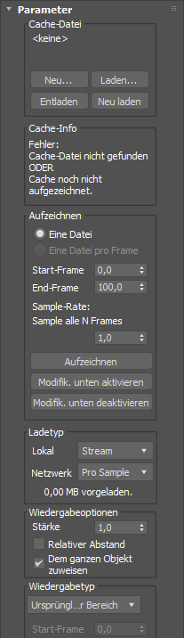 3ds Max zeichnet die Animation in der Cache-Datei auf. Anschließend wird der Name der Cache-Datei im Bereich "Cache-Datei" angezeigt.