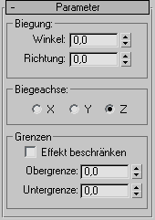 Legt die Achse fest, die gebogen werden soll. Beachten Sie, dass es sich dabei um die lokale Achse des Biege-Gizmo handelt, die sich nicht auf das ausgewählte Objekt bezieht. Vorgabe = Z.