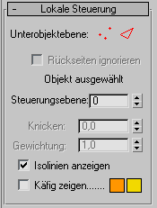 Das zweifarbige Drahtgitter, das das geänderte Objekt vor der Unterteilung darstellt, wird ein- bzw. ausgeblendet. Die Farben des Käfigs werden rechts neben dem Kontrollkästchen als Muster angezeigt. Die erste Farbe steht für nicht ausgewählte Kanten auf der Unterobjektebene "Scheitelpunkt", die zweite für nicht ausgewählte Kanten auf der Unterobjektebene "Kante". Die Farben können über die Farbfelder geändert werden.