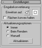 Aktualisiert das Objekt im Ansichtsfenster, sodass es den aktuellen Einstellungen für "MeshSmooth" entspricht. Diese Funktion ist nur verfügbar, wenn Sie "Beim Rendern" oder "Manuell" gewählt haben.