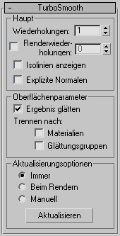 Aktualisiert das Objekt im Ansichtsfenster, sodass es den aktuellen Einstellungen für "TurboSmooth" entspricht. Diese Funktion ist nur verfügbar, wenn Sie "Beim Rendern" oder "Manuell" gewählt haben.