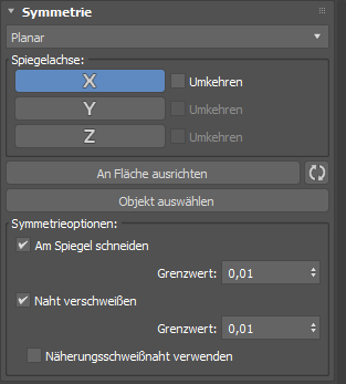 (das Pluszeichen) zum Erweitern der Hierarchie des Modifikators "Symmetrie", und markieren Sie "Spiegeln".