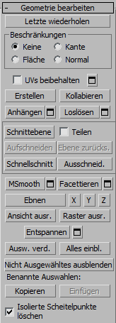 Ausführliche Beschreibungen dieser Steuerelemente finden Sie unter Rollout "Geometrie bearbeiten" ("Polynetz" und "Poly bearbeiten").