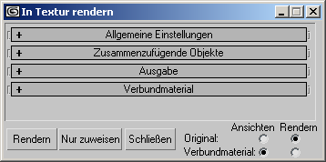 Das Rendern in Textur bzw. Einbacken von Texturen wird über dieses Dialogfeld gesteuert. Die meisten Steuerelemente des Dialogfelds befinden sich in den Rollouts.