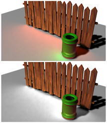 - Steuert die Stärke des Farbverlaufs. Farbverläufe entstehen, wenn Objekte in der Szene das Licht gegenseitig reflektieren. Vorgabe = 1,0.