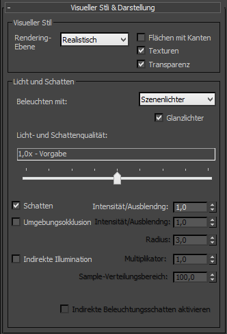 Mit diesen Steuerelementen wählen Sie den visuellen Stil für das Rendering und wie der Renderer die Beleuchtung handhabt.
