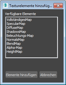 In diesem Dialogfeld können Sie wählen, welche Elemente Bestandteil des Einbackmaterials sein sollen. Jedes Element entspricht einem einzelnen Bitmap. Wenn Sie eine Einbacktextur in schattierten Ansichtsfenstern anzeigen, werden manche Elemente unter Umständen nicht dargestellt.