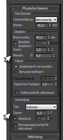 Während Sie die Szenen in 3ds Max entwickeln, müssen Sie mit mehreren Einstellungen für die Blende experimentieren, um die richtigen Bedingungen für die Belichtung zu schaffen. Einige dieser Einstellungen hängen von Geschwindigkeit und Blende ab; insbesondere die physische Kamera modelliert eine physische Belichtungssteuerung.