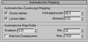 Diese Optionen legen fest, wie UVs abgeflacht werden, wenn im Bereich "Mapping-Koordinaten" des Rollouts "Zusammenzufügende Objekte" die Option "Automatisches Map verwenden" gewählt ist.
