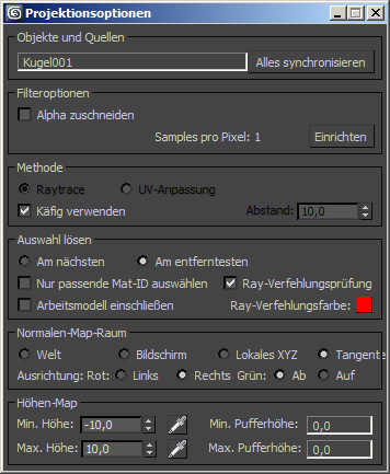Die zwei Optionsfelder sind für Szenen, die halbtransparente Objekte beinhalten; in diesem Fall kann für jeden Strahl mehr als eine Auswahl gefunden werden. Bei den übrigen Steuerelementen in diesem Bereich handelt es sich um weitere Steuerelemente für die Projektion.