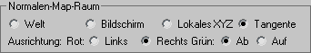 Beispiel: Wenn Sie im Tangentenmodus Rot für Rechts und Grün für Unten festlegen, sind die Normalen von Bereichen, die im Normalen-Map rot angezeigt werden, nach rechts gerichtet, die Normalen von grün angezeigten Bereichen nach unten.