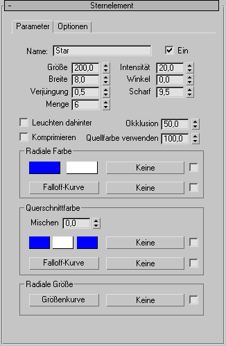 - Gibt die Gesamtschärfe des Sterns an. Höhere Werte erzeugen klar definierte und voneinander abgesetzte Sterne. Kleinere Werte erzeugen einen Effekt, der mehr einem sekundären Leuchten ähnelt. Bereich = 0 bis 10.