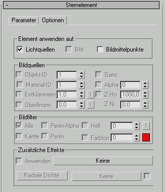 - Gibt die Anzahl der Spitzen im Sterneffekt an. Die Vorgabe ist 6. Die Spitzen werden gleichmäßig um den Mittelpunkt des Blendeffekts verteilt.
