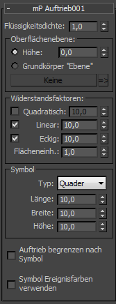Beispiel: Nehmen wir an, dass Quadratisch deaktiviert und Linear aktiviert ist. In diesem Fall ist die gesamte Widerstandskraft des Objekts das Produkt aus Multiplikation der Objektgeschwindigkeit, dem Wert für Linear und der tatsächlichen Querschnittsfläche des Objekts in Richtung der Bewegung. Dieses Produkt wird dann durch den Oberflächeneinheitswert geteilt, um die Widerstandskraft zu ermitteln.