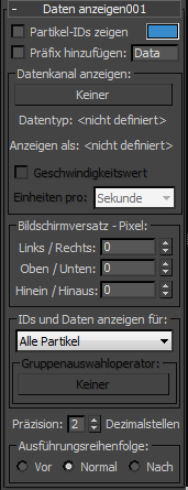 - Zeigt die ID jedes Partikels vor den angezeigten Daten an. Die Partikel werden in der Reihenfolge ihrer Erzeugung nummeriert, wobei das zuerst erzeugte Partikel die Nummer 1 erhält. Der ID folgt zur Unterscheidung von den Daten das Symbol >.