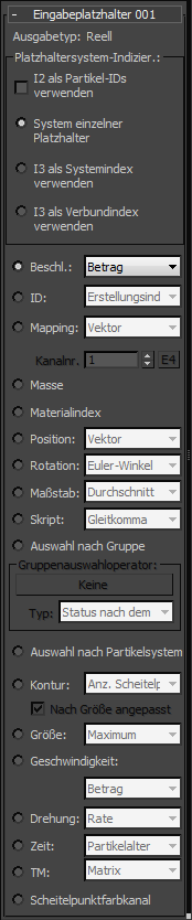 Aus den übrigen Eingabeplatzhalter-Einstellungen können Sie die Eigenschaft(en), die aus dem Platzhalter-Partikelsystem kopiert werden soll(en), auswählen.