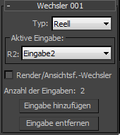 - Mit dieser Option können Sie zwei unterschiedliche Datenflüsse organisieren: einen für Rendering und den anderen für die Ansichtsfenster. Das Kontrollkästchen ist nur verfügbar, wenn die Anzahl der Eingaben auf 2 steht. In diesem Fall entspricht die erste Eingabe Rendern, und die zweite Eingabe Ansichtsfenster. Wählen Sie die Eingabe und aktivieren Sie anschließend Render-/Ansichtsfensterwechsler. Daraufhin wird Aktive Eingabe abgeblendet und zeigt die aktive Auswahl. Wenn Render-/Ansichtsfensterwechsler aktiviert ist, werden auch die Schaltflächen Eingabe hinzufügen und Eingabe entfernen abgeblendet.