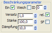 Die Abstandsabweichung zwischen einer beschränkten Gruppe und dem beschränkenden Objekt bzw. Zielobjekt. Der Standardwert bei aktiviertem "Rel" lautet 1,0 (Informationen dazu finden Sie im folgenden Abschnitt). Dadurch behält die beschränkte Gruppe die ursprüngliche Entfernung vom Zielobjekt bei. Wenn für diese Option der Wert 0,0 definiert ist, versucht die Beschränkung den Abstand zum Zielobjekt auf Null zu setzen.