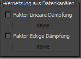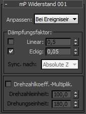Für den Zugriff auf dieses Rollout markieren Sie den Operator mParticles-Widerstand im Ereignis, klicken mit der rechten Maustaste darauf und wählen aus dem Menü die Option Skriptvernetzung verwenden. Dadurch können Sie die Werte Faktor Lineare Dämpfung und Faktor Eckige Dämpfung pro Partikel mit einem Datenoperator festlegen. Die Vernetzung legt nur Werte für Dämpfungsfaktor fest. Wenn der Drehzahlkoeffizienten-Multiplikator aktiviert ist, wird der Effekt des Multiplikatorfaktors darübergelegt.