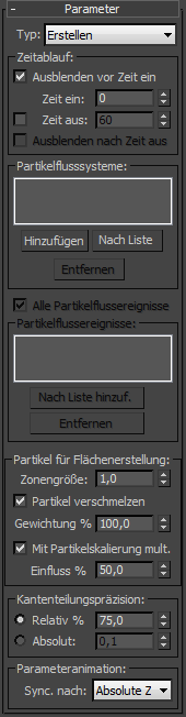 - Der Modifikator Partikelflächen-Erstellung funktioniert durch dynamisches Unterteilen und Stutzen der Geometrie beim Vorbeibewegen von Partikeln. Somit werden fließende Ränder zwischen sichtbaren und verdeckten Teilen des Objekts möglich. Diese Einstellung legt fest, wie die Geometrie gestutzt wird, wenn nur ein Teil davon angezeigt wird.