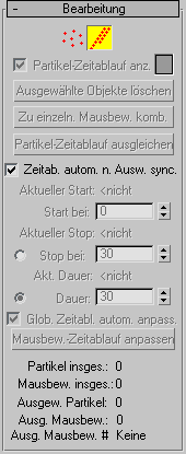 Mit dem Rollout "Bearbeitung" können Sie nicht benötigte Partikelausgangszahlen oder komplette Mausbewegungen entfernen, den Zeitablauf von Mausbewegungen und Partikeln einstellen sowie Partikel und Mausbewegungen auswählen. Diese Auswahldaten können Sie anschließend an die Operatoren "Erzeugung malen" und "Platzierung malen" weiterleiten. Es gibt keine Möglichkeit, ausgewählte Partikelausgangszahlen direkt mit Standardhilfsmitteln von 3ds Max wie Verschieben und Drehen zu manipulieren.