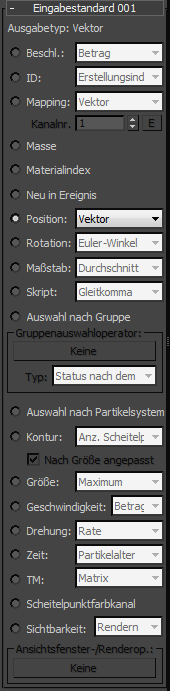 Eingabestandard kopiert gebräuchliche Partikeleigenschaften wie Position, Geschwindigkeit, Skalierung usw. aus dem aktuellen Partikelsystem. Die Parameter entsprechen denen des Unteroperators Eingabeplatzhalter, mit dem Unterschied, dass es keine Steuerelemente für die Platzhaltersystem-Indizierung gibt.