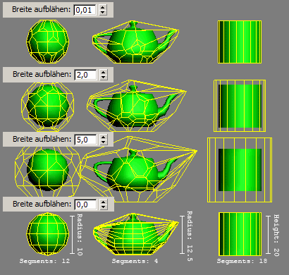 - Skalierung % Dient als Multiplikator der vorhandenen Bemaßungen. Beispiel: Mit der Einstellung Quader können Sie die Proportionen mit Breite/Länge/Höhe und anschließend die tatsächliche Größe mit Skalierung % festlegen.
